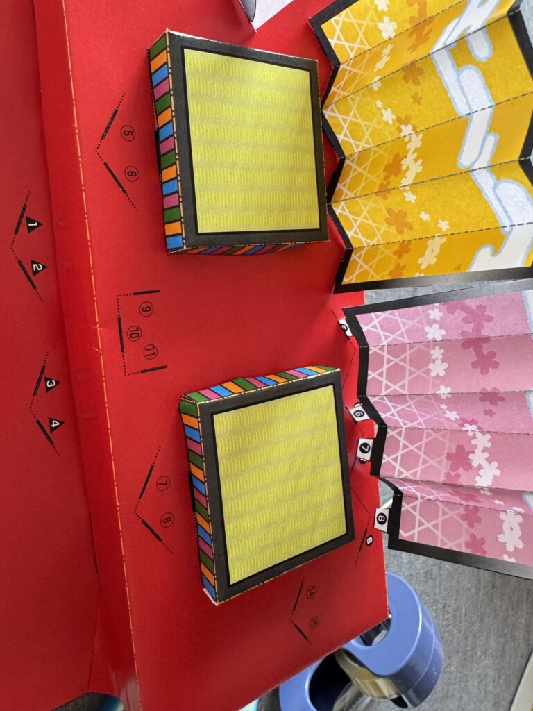 線に沿ってひたすらはさみで切って、のりづけやカッターで切り込んだ部分へ差し込んだり、かなり細かい作業でした。